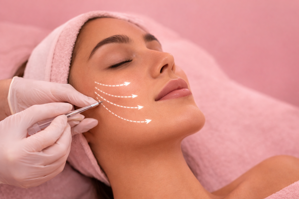 Hilos PDO y espiculados que tensan y redefinen el óvalo facial con un “efecto lifting” sutil. Estimulan el colágeno propio para resultados graduales y naturales.